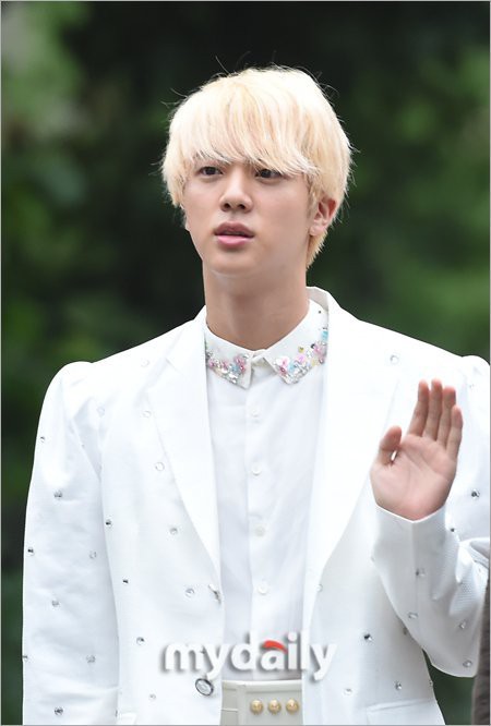 Từ đầu đến chân: tóc trắng, vest trắng vai bồng chấm bi kim cương, sơ mi cổ hạt cườm, quần ống vảy hoạ tiết hoa vàng lúng liếng và một đôi giầy gót cao màu bạc?? Cần gọi ngay cho cảnh sát thời trang ra bắt Jin lại đi!!