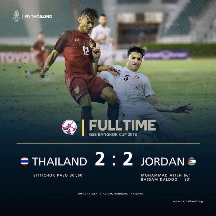 Hôm qua, loạt trận trước tiên của giải đấu này đã diễn ra và ở khung 19h30, chủ nhà đụng độ Jordan. Trận này, Thái Lan ghi 2 bàn dẫn trước ở các phút 29 và 59, nhưng đến phút 66 và 83 thì bị gỡ hòa 2-2.